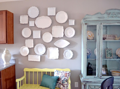 For a while now I was trying to come up with an idea for my empty wall space in my dining room. I wanted something random & eclectic. I brainstormed a few ideas such as hanging antique colanders & antique kitchen utensils, which would still be a great idea, but then I was inspired by The Nesting place’s random plate wall. Just the idea of an eclectic mix of white plates on a wall makes me a happy girl! So here is my adventure into hanging plates on a wall..