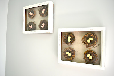 These nests I bought at a local craft store. I am sure you could find them anywhere. These conveniently came in packs of four for $3.99. I think more art work will be added to this wall along with these shadowboxes for a more eclectic look.