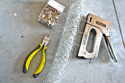 Wire cutters, Staple gun, chicken wire, binder clips & window frame…