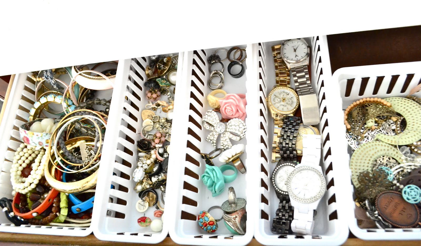 I separated my bracelets, stud earrings, cocktail rings, watches & hanging earrings.