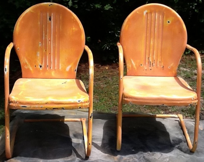 Love these vintage outdoor chairs from Ms. Lela Mac.. You can’t go wrong with a bright color, a little rust & some cute chairs.