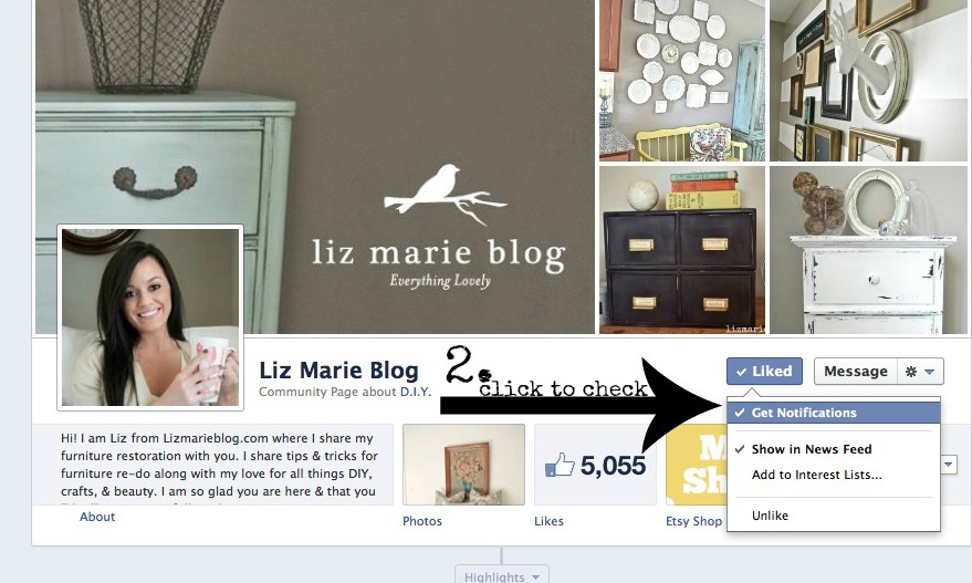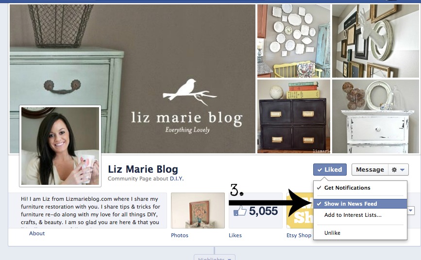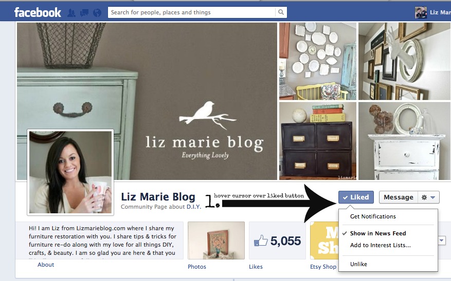 First of all you want to hover your cursor over the “liked” button on the Liz Marie Blog facebook page {here} You will see a drop box with some options in it like: Get Notifications, Show In Newsfeed, & add to Interest lists…