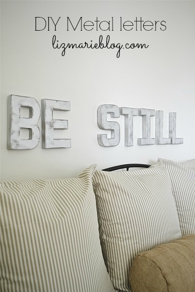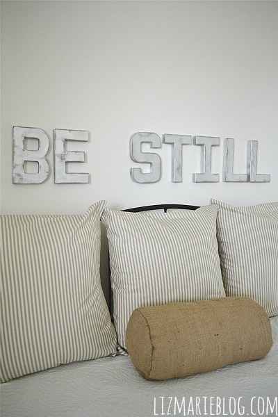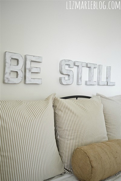 Ever since our loss I have been very into cleansing and making things new again. I have been all about clearing out the clutter in our home & my favorite saying is “out with the old”. Am I the only one who gets satisfaction out of donating, selling, and throwing away clutter? We have re-painted most of the house {which I still need to give an update on… I know!} & the front bedroom is the latest victim. The walls are painted, & now the room is slowly coming back together. Last night I hung these DIY Metal letters that I made. For some reason the verse “be still & know that I am God” comes to my head in those moments when things seem to be overwhelming & too much to handle. This room is going to be a reading room, a relaxing room, & the room you go to to take an afternoon nap in. Peaceful. I am not one for “words on the wall” but these words seemed very appropriate and are a great daily reminder for our house. & my heart wanting me to do this, & we all know you must listen to your heart.