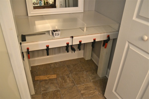 We built a frame and placed a piece of plywood on top to make box with an open bottom. This is going to be used as the base of the vanity and where the legs will attach.