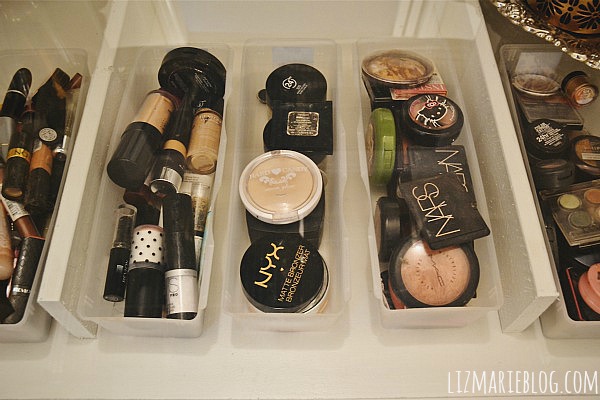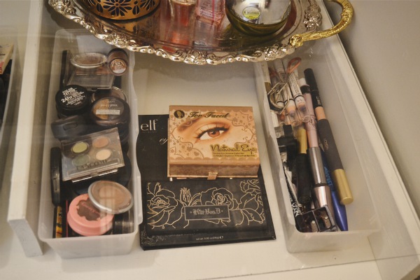 The plastic containers were purchased at the dollar store. I was seriously impressed with the quality of them & how much they held. Being a hoarder of more than just furniture & even though I hardly ever wear more than concealer, eyeliner, mascara, & bronzer this is all just to fun to play with on special occasions to get rid of it đ