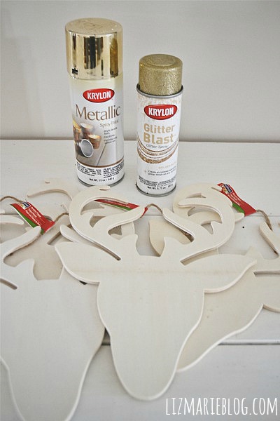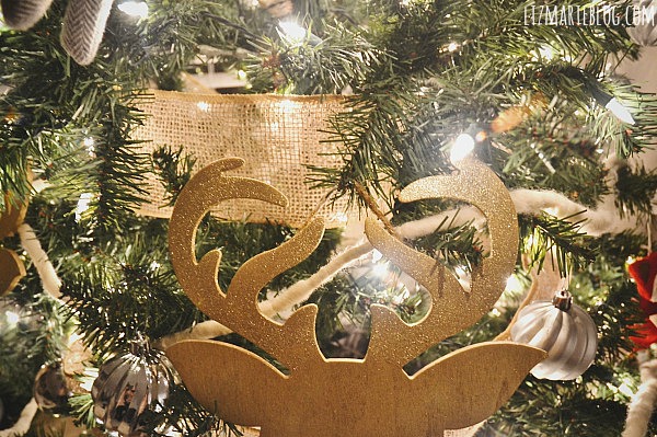 How cute are these little wooden deer silhouette ornaments? I picked these up at Michaels for about $1.50 a piece. They had so many others to choose from too, so you could do this with any of the pre-made ornaments they had. I also picked up some solid gold spray paint & some glitter gold spray paint. To do this simple minute craft I sprayed the entire ornament the solid gold color. After that {it only took one coat} I sprayed the antlers with the glitter spray paint. I didn’t tape the rest of the silhouette off because the glitter sprayed with a lot of precision. & there you have it. Some gold deer ornaments for your tree. These are also quite large so you could hang them other places in your house as well for decoration. You can experiment with different colors, get fancy and add some embellishments, there are so many options.