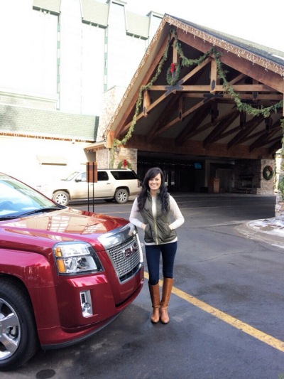 Tuesday morning was lovely. I woke up to the view of the mountains & the pool area out of my room. So perfect! I ate a lovely breakfast looking out at that beautiful scenery, met up with the crew, & got acquainted with our GMC denalis & headed up the mountains to the 2014 HGTV Dream Home. I got to be the first driver up the mountain & I drove the GMC Terrain Denali & it was perfect for me! It’s a smaller SUV so I felt really comfortable & driving over ice & snow didn’t even scare me because of all the control & the all wheel drive made me feel extra secure. Also driving on mountains was easier because it has automatic grade breaking for going down the mountain & it has hill start break assist which helps when breaking on an up-hill. So basically the terrain was perfect for me to drive up the mountain to see the house. & I looked pretty cute driving it too 😉 I kid, I kid!! No, but really I love GMC as a company & their product amazes me every time I experience them.