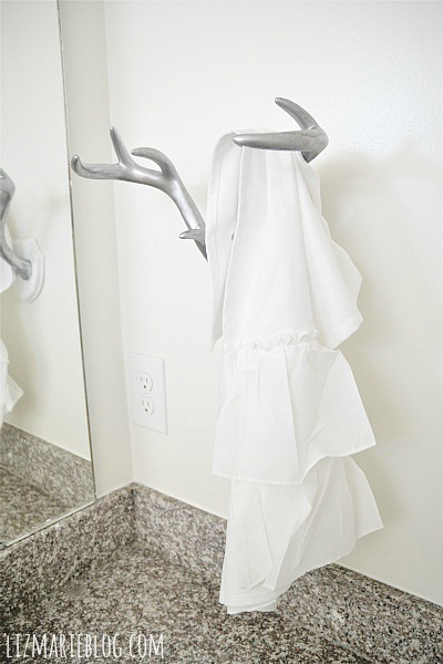 I’m pretty obsessed with these towels on our DIY vintage window shutter towel rack, but we also made a hand towel for the guest bathroom out of antlers that I bought from Target on clearance…