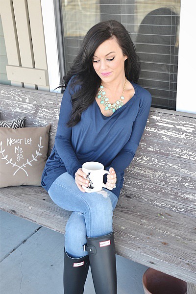 I’m loving this this Essential long sleeve top in navy so much right now. If you know me, you know I’m a t-shirt & jeans kind of girl. I love casual & cozy & this shirt is all that. It’s loose and flowy & snug in the arms. The necklace is barbados mint necklace & I love that it dresses up a plain t-shirt so easily.