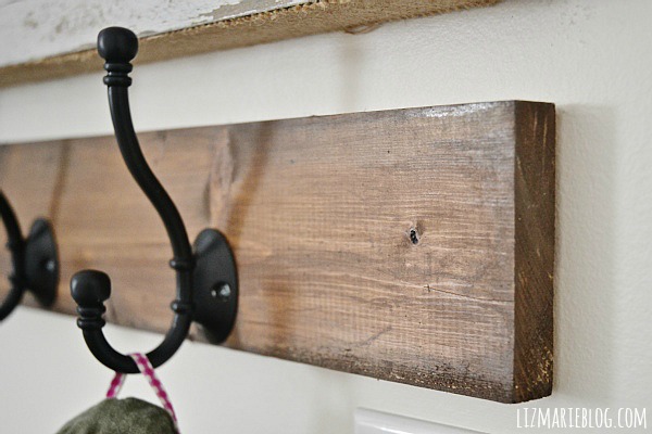Before we hung up the art I knew that I wanted to make some kind of coat rack for below the piece. I actually had a board in my garage that happened to be the same length as the art already.. score! I stained it with Minwax special walnut & mounted 4 coat hooks that I picked up at Lowes. Super simple!