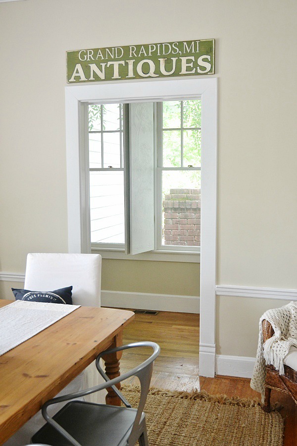 As I was hanging my hand painted DIY antique sign in our dining room in the new house I realized that I had never blogged about it before. I had shown it in our last house in a few posts in our kitchen, but I never shared how I painted it so I wanted to share that with you today. Making an “antique sign” is pretty easy & it can become addicting, but it’s a fun addiction so don’t be scared…
