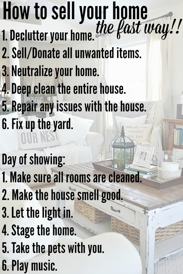 Wipe down all your counters, clean the toilets, clean appliances, vacuum, mop, wash windows & mirrors, & double check for any messes through out your home before you show your house. A clean house is way more appealing and helps show buyers the potential of the home.