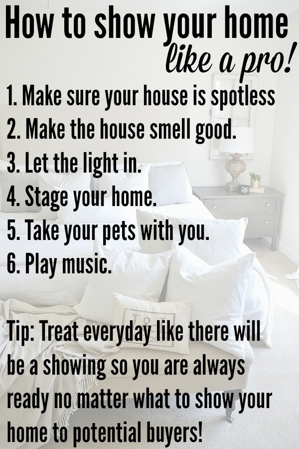 Before the buyers come, be sure your home is staged to appeal to buyers. Remove any unwanted items from view, make sure your whole house is organized. Place throw pillows around your home with throws & home decor to really amp up your showing & set your home apart from other houses the buyers have looked at.