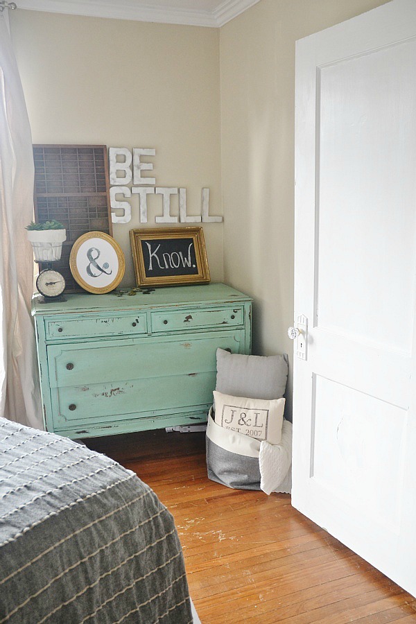 The art above the dresser was a happy accident. The ampersand was exactly where it is now & I hung my DIY metal Be Still letters up & when I stepped back to take a look I saw that it said “Be still & ___” just like one of my favorite verses “Be still & know that I am God” Psalm 46:10. So, of course I had to finish the sentence some more so I added the chalkboard sign that says “know”. It’s quirky, but it’s a fun addition to the guest room. The tote on the floor is from Initials inc. & I love how it ties in the gray from the bed throw.