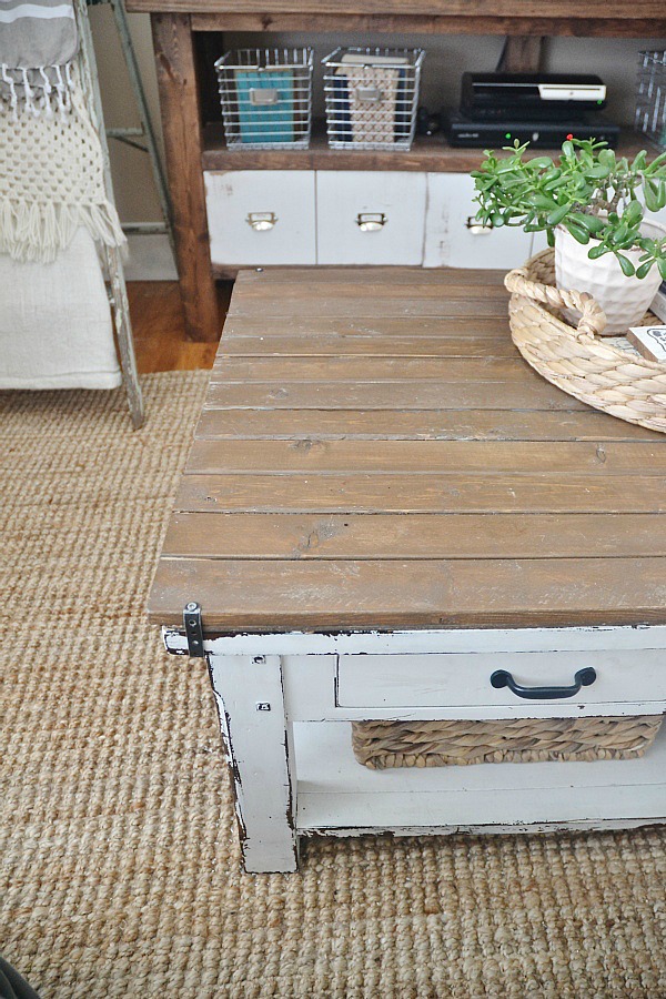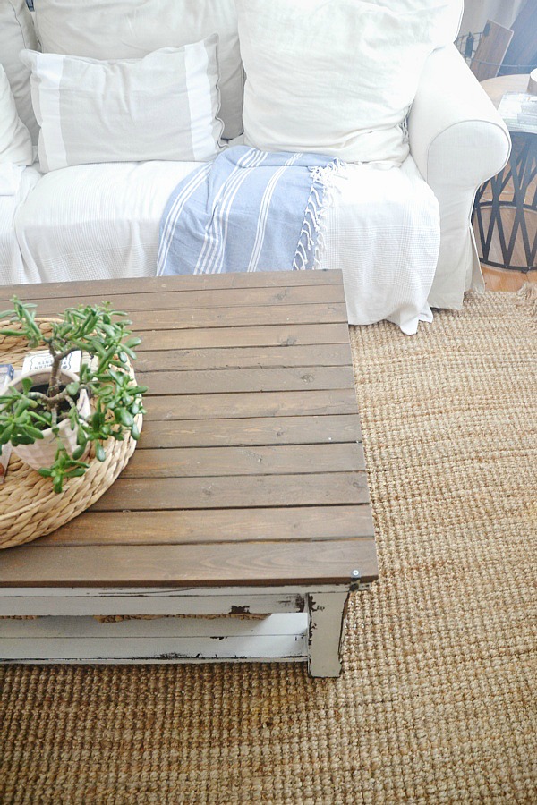 A little bit about this side of the coffee table. This side sits in the sun all day & for some reason it makes the milk paint chip off of the coffee table & fall onto the floor. A little annoying because I am having to vacuum this rug a lot because of it, but I am not sure if that’s normal for milk paint to do or if it’s just on this piece. And again, it’s only on the side of the table that sits in the sun.