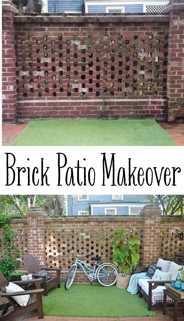 A few weeks ago I shared a sneak peek of our summer brick patio DIY seating area. Well, I was waiting on a few more things to complete the space, but I got tired of waiting for those things & decided to show you the space anyways. I mean what’s the fun in waiting? As many of you know we sold our house in the suburbs a few months ago & now we are renting a home in the historic downtown area. We have a lovely brick patio with no grass in our yard at all. The backyard is also surround by brick walls & lots of greenery. Of course when the hurricane hit last week the backyard took a tiny hit, but it’s still looking cozy & inviting for a summer night on the patio. On that note, this is what I did with one corner of our back patio.