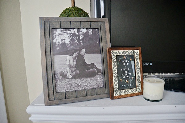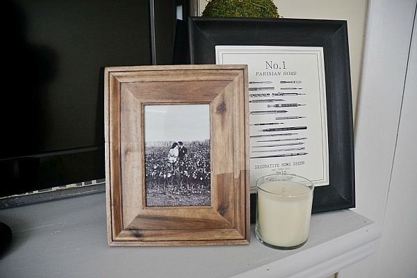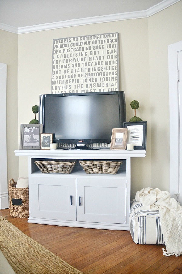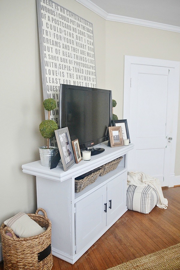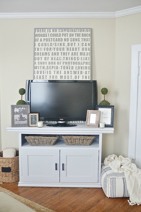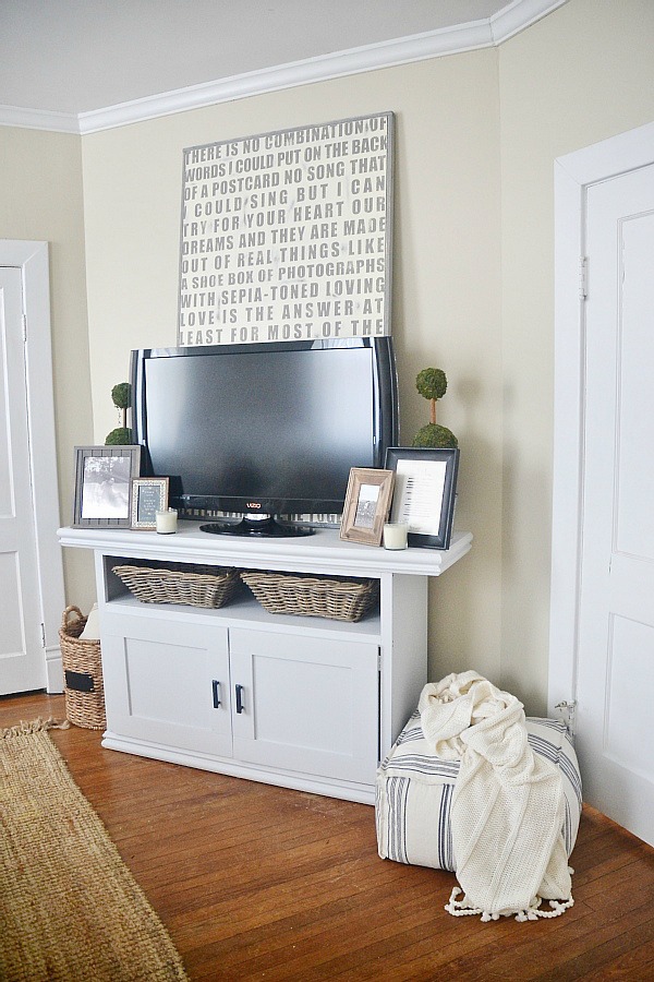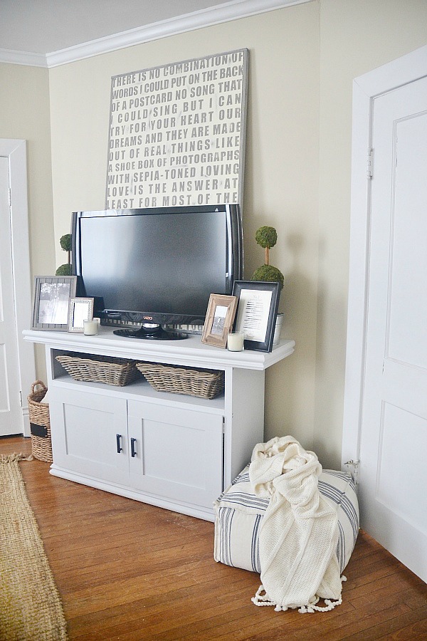 The setup on the console was kind of thrown together last minute, but I’m actually kind of in love with how different it is. I placed our House of Belonging sign behind the TV {which is a 42″ TV by the way for size reference} & on the shelf I placed two baskets from Ikea. I placed the House of belonging sign behind the TV instead of hanging it because we are about to move & we didn’t want to make anything permanent. No worries, it will be hanging in our Michigan house very soon! The frames are a mix of Target & TJ Maxx. The candles are from….. & the pouf & the throw and blanket are from Target. The topiaries are a DIY project from a long time ago {here}. The cabinet is painted with Behr Marquee paint in Gray Shimmer. It’s a super light gray that’s not too bold, but it’s the perfect subtle light gray color for this room.
