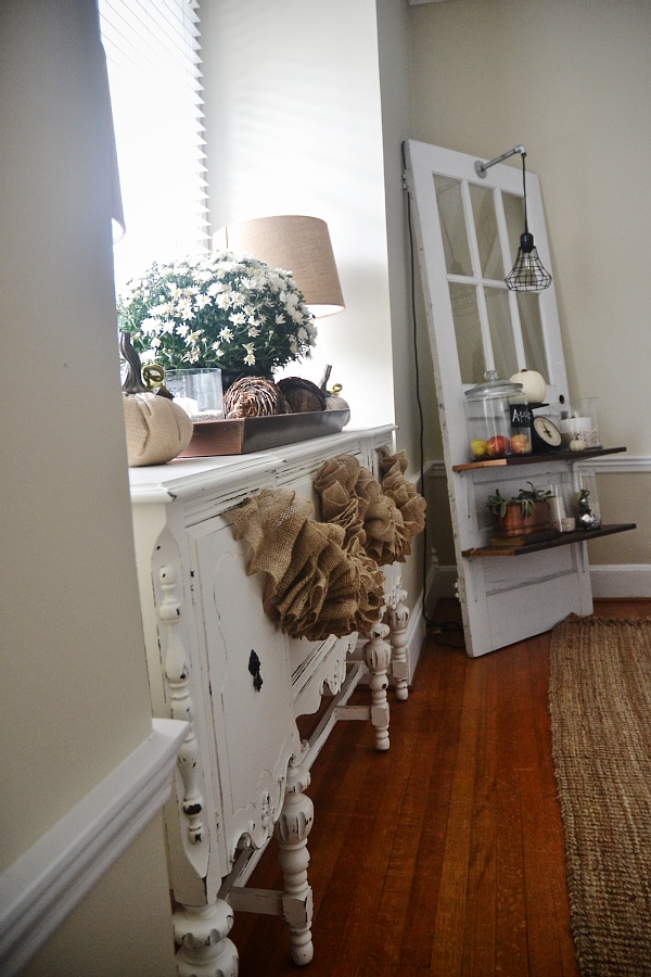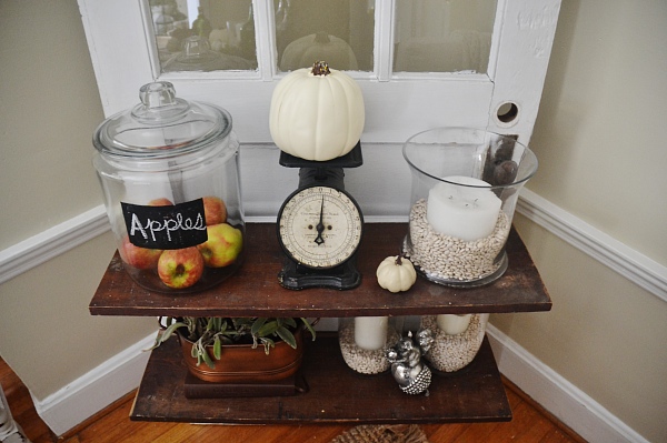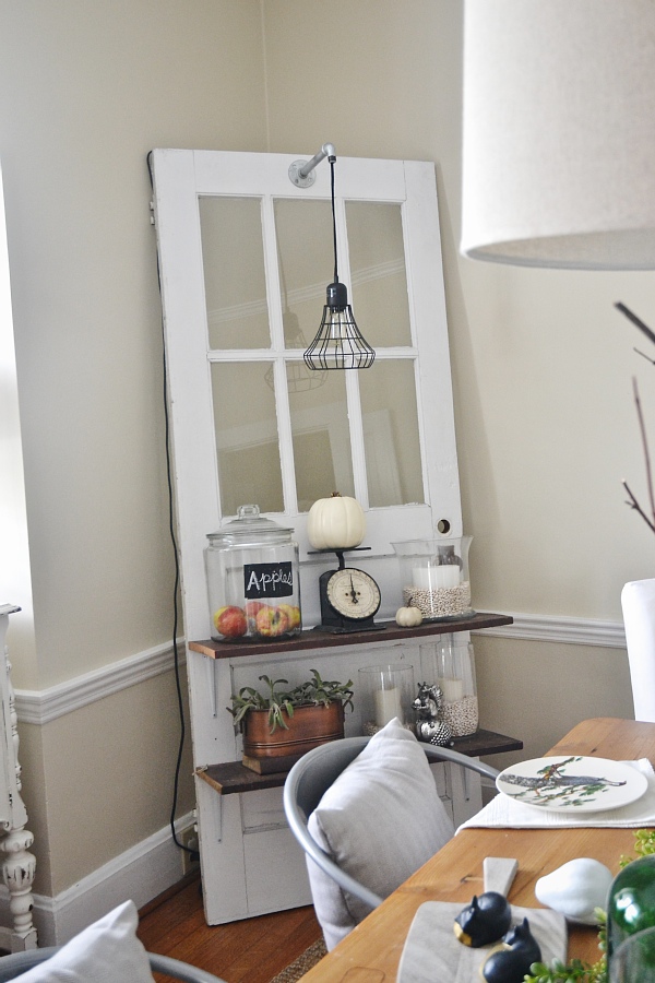 […] Liz Marie at her little corner of the blog world shares a stupendous fall decor where along with other stunning decor objects, she has placed a door with shelves and a lamp too to create a display. […]