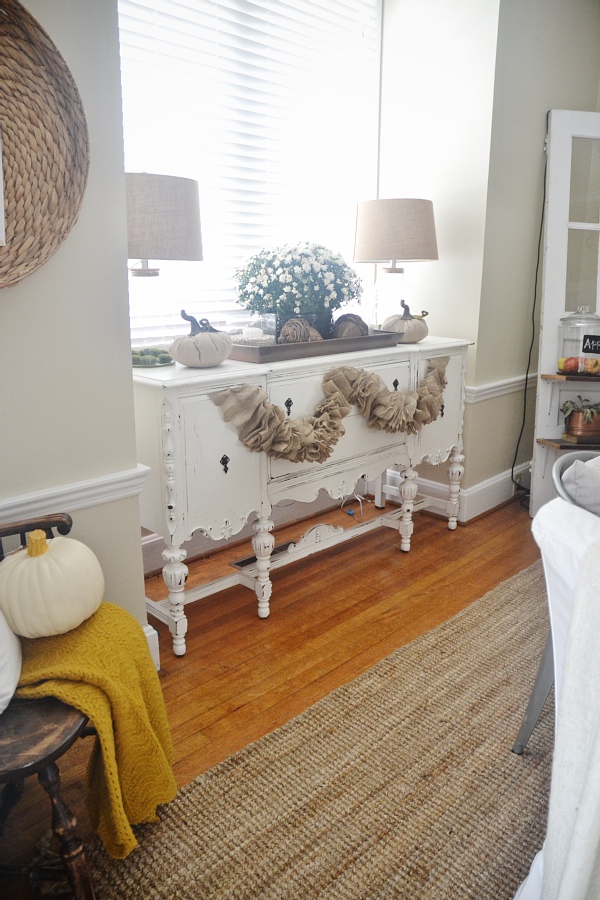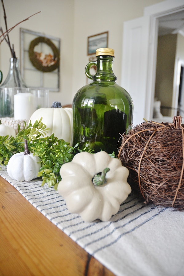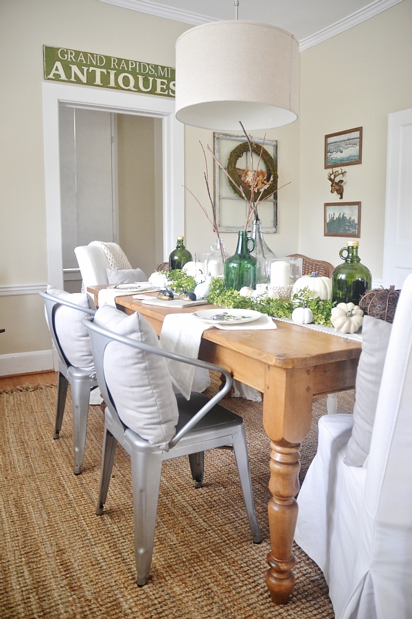 Happy first day of fall!!! Oh my. I just love this historic rental of ours & I was so excited to decorate it for fall. this house is just so cozy & I knew it would be perfect for autumn decor. This year I wanted to go really neutral for our early fall decor. Last years fall dining room at our craftsman drive house {See links below} had a lot more pops of color & I loved it, but of course I had to change it up this year. I wanted something simple, neutral, & with some pops of green because it’s early fall & lets face it, I love green. I will bring in more pops of autumn color later this fall so stay tuned for that. The focal point in this room is for sure the table & the rustic centerpiece. I used some lovely glass jugs, painted pumpkins, & some boxwood greenery to bring the fall vibes in the dining room.