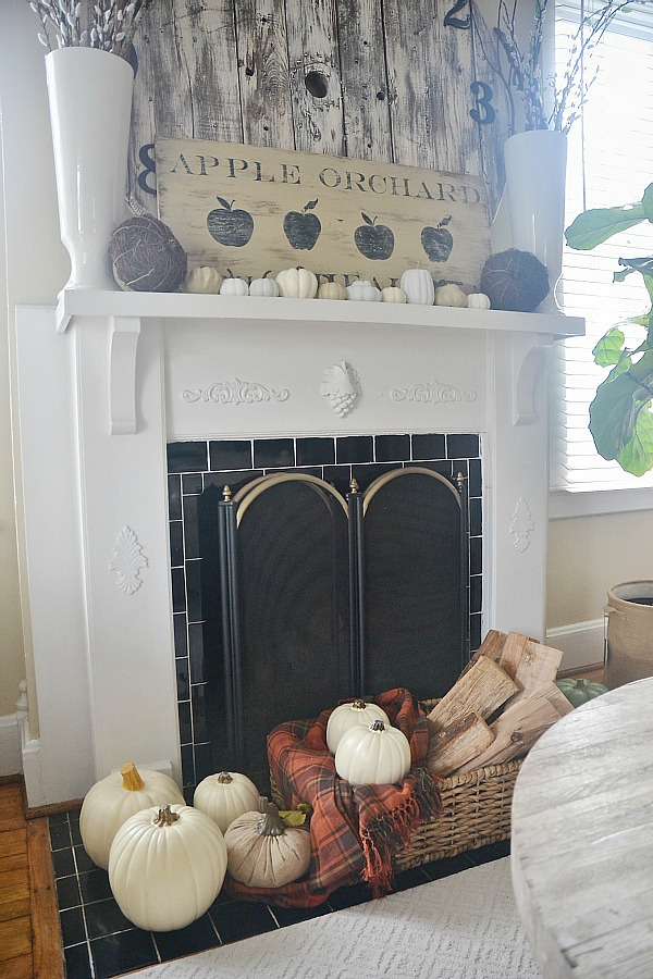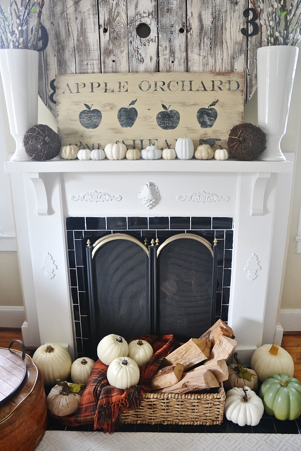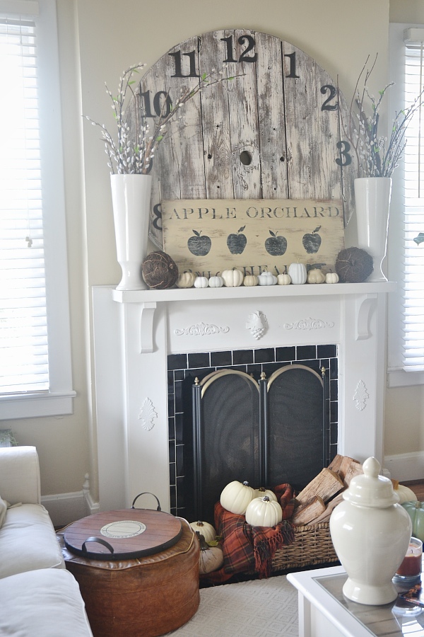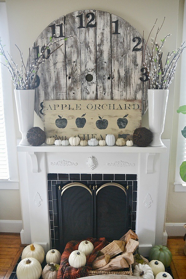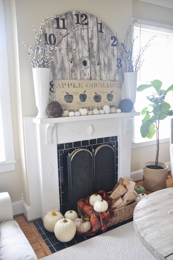 I have to set the mood for these photos. It was raining outside & it was the first day that it was in the 60’s outside here in NC this & it was the first day of fall today. As I was taking the photos I had the front door wide open, music playing, & I could smell the fall scentsy from the kitchen. My heart was so happy. So thankful for a beautiful rainy fall day, our lovely rental, & this simple fall mantel. I love moments that make me stop and thank God for this beautiful life we live. It’s funny how styling a fall mantle can make you appreciate life. The pallet clock is a DIY {here}, The orchard sign was also a DIY that is coming soon, the pumpkins were collected from various places, & the plaid “blanket” is actually a tablecloth I found at Marshalls. What do you think of our early fall mantel? Do the pumpkins make you excited for the autumn season? Let me know what you think in the comments below, find me on Facebook, or chat with me on Instagram.