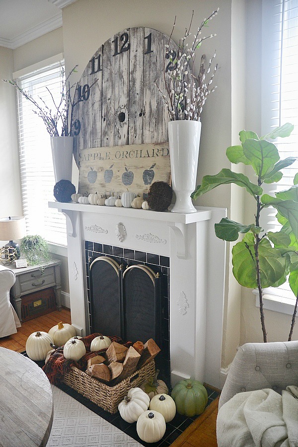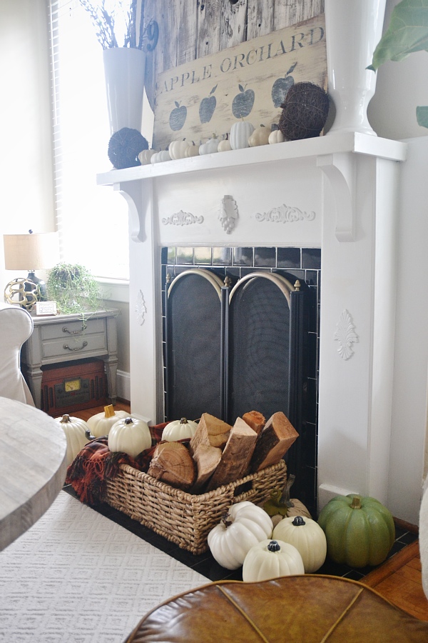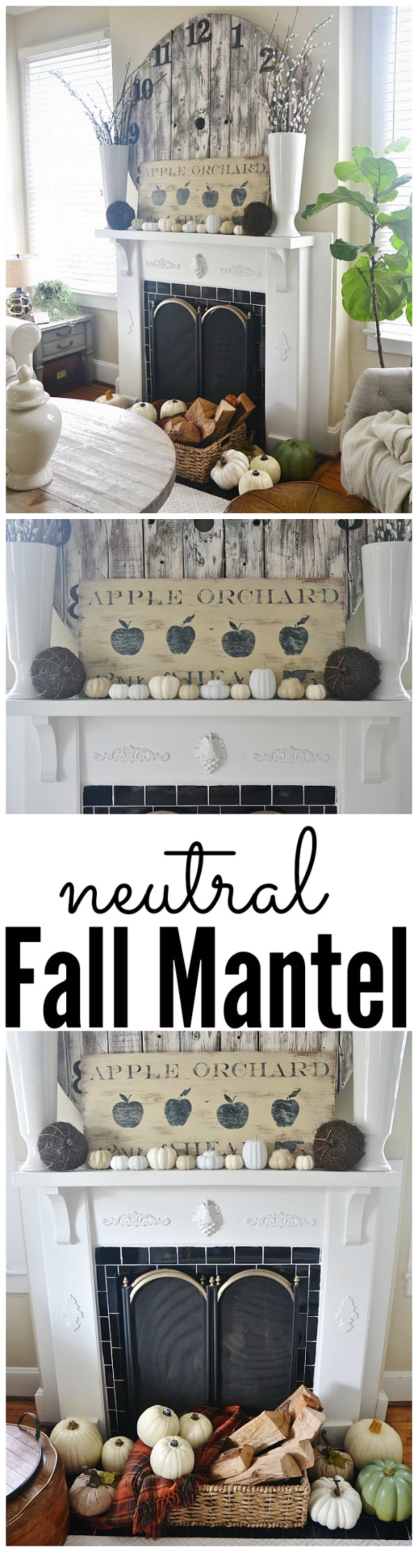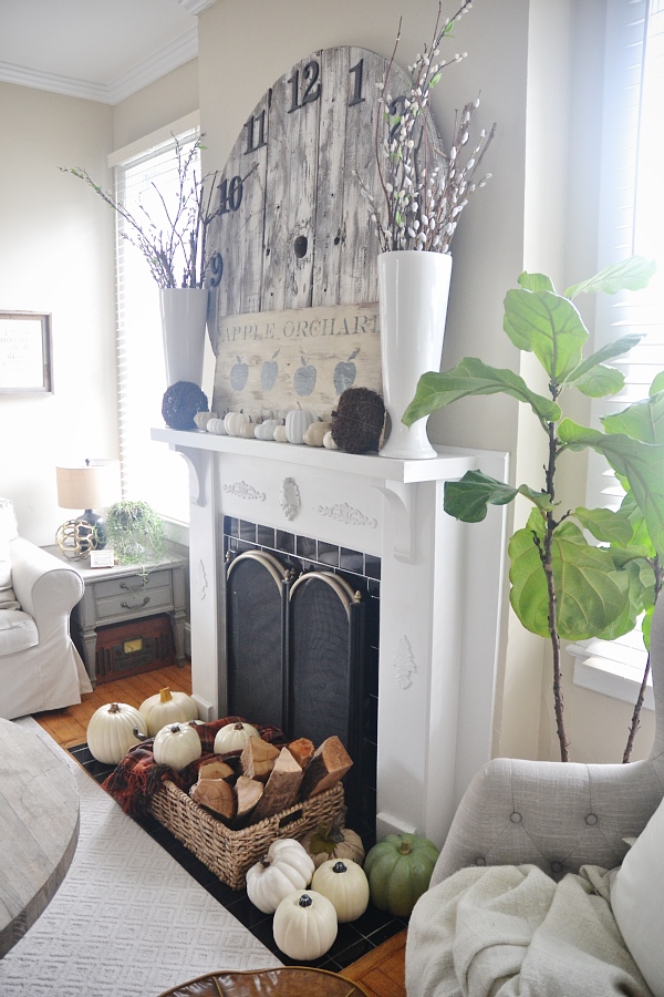 If you follow me on any form of social media regularly or even here on the blog, you know I was so excited to decorate our rental for fall. It’s really funny because we have never lived in a house yet that has had a mantel so I was extra excited to decorate this one in our historic home for fall this year. It’s a really small mantel & I had so many ideas that I might even do two fall mantels, but for now I did a really neutral fireplace mantel with tons of pumpkins of course. I love this cozy easy care free fall decor & it’s something that can be whipped together in 5 minutes which is even better. Oh, & you might notice that half way through me photographing the mantel today that the coffee table changes. #lifeofaDIYblogger. Seriously, the hubs and I made a coffee table half way through shooting the photos and moved it into our front sitting room, more on the lovely table later! I hope you love our cozy sitting room fall mantel.