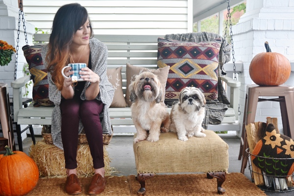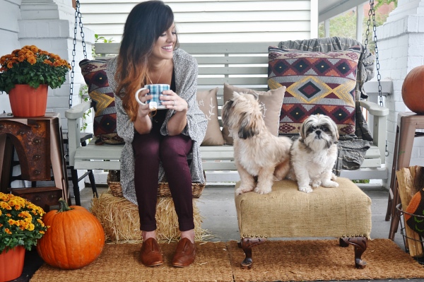 I love the color of your skinnies in your outfit and the overall outfit, too! That photo with your dogs is a framer! Such a great porch for the fall, I am still working on getting mine together.