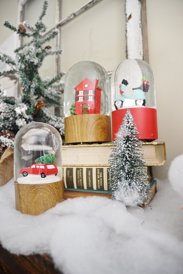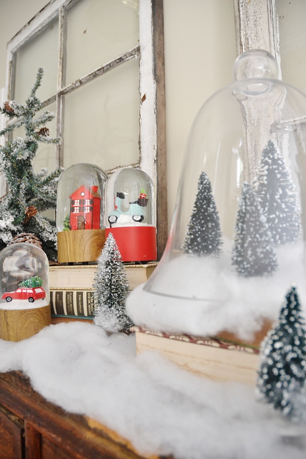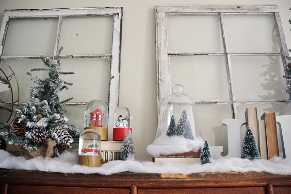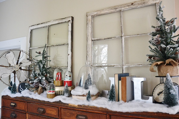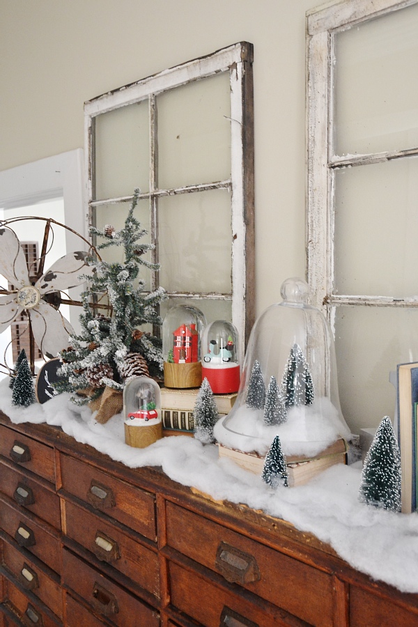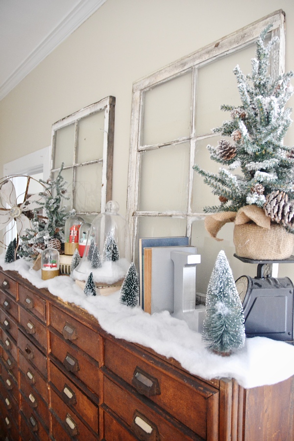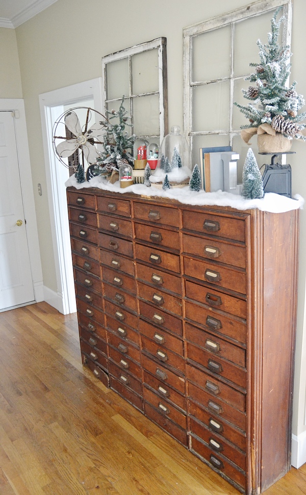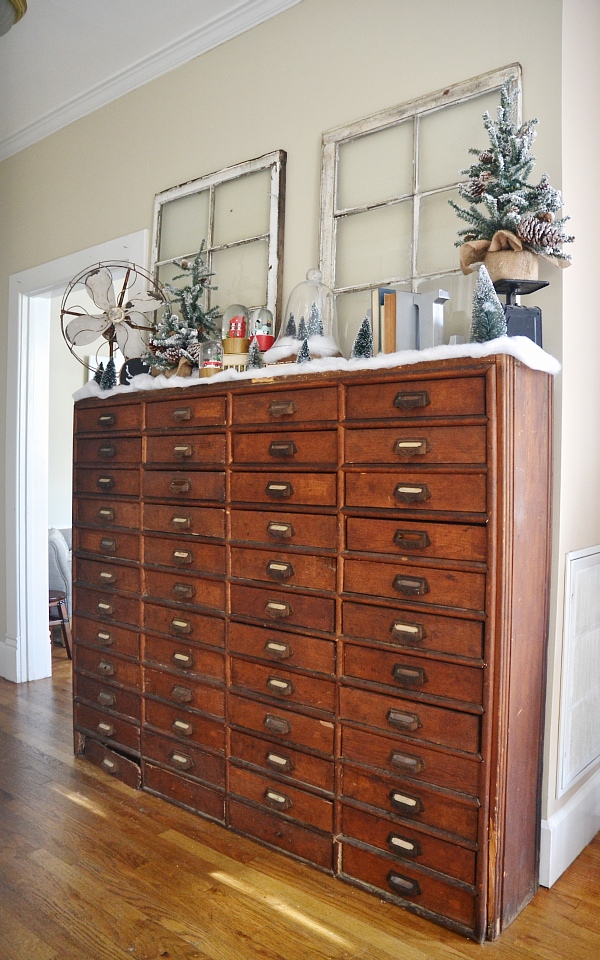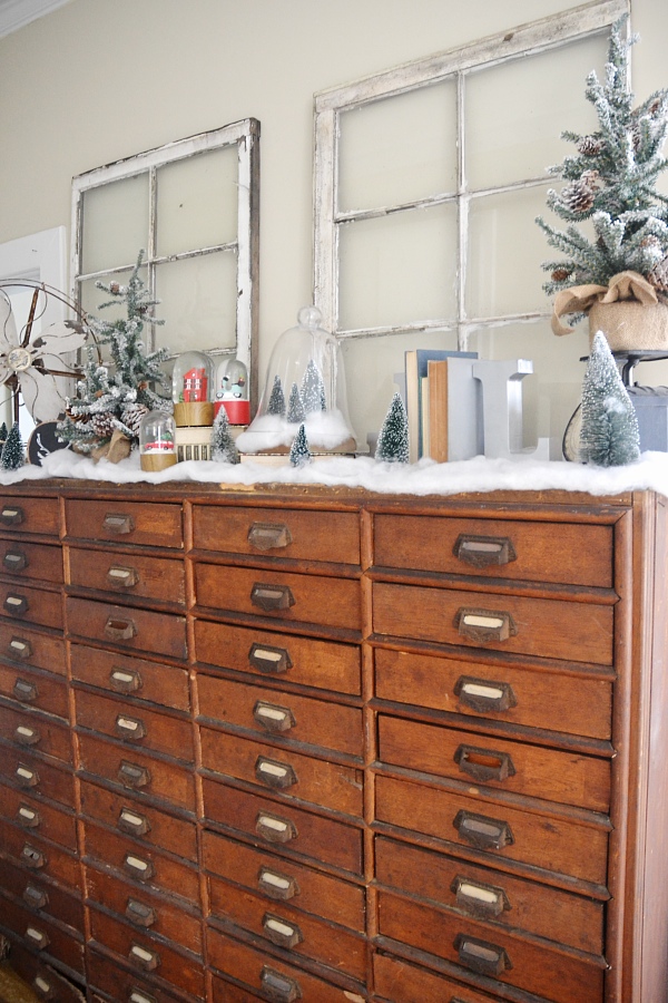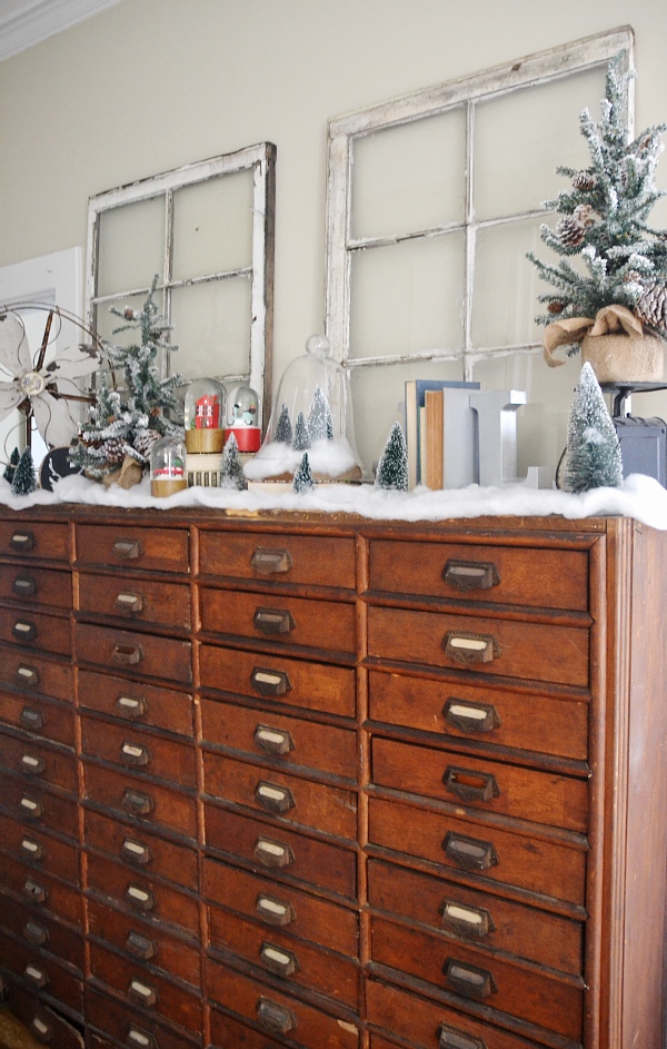 My vision for this piece was a Christmas village. Of course this isn’t a Christmas village, but I wanted it to reflect one in some way. Some faux snow, the decor that was already on the card catalog like the antique fan, & some added snow globes & Christmas trees adds a little whimsical holiday touch to my favorite piece of furniture in the house. I struggled with what art to put above the card catalog & tried a few things like hanging Christmas plates & other things like that, but I finally settled on some simple antique windows. I love decor like this that proves simple can be beautiful!