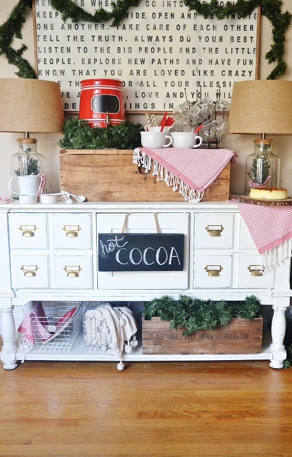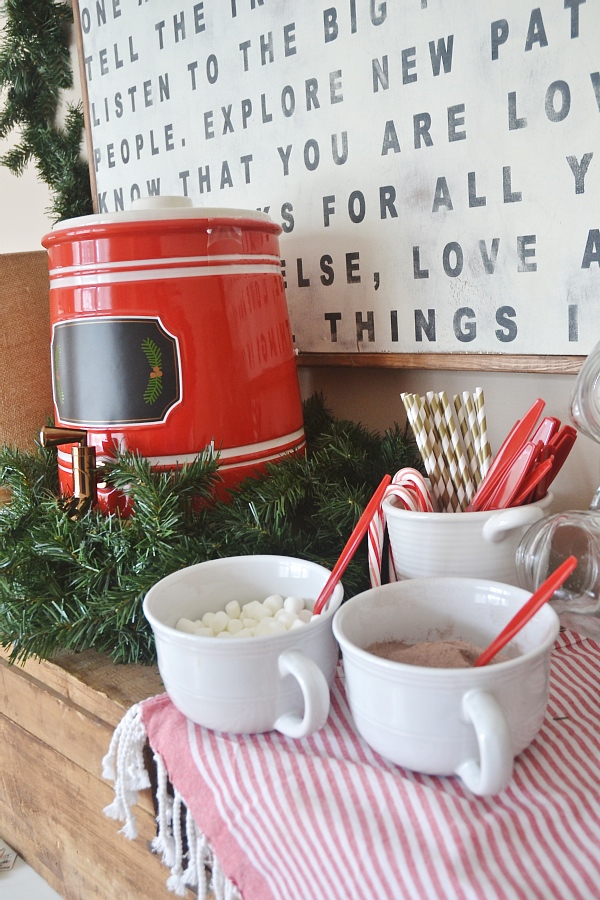 Making a hot cocoa bar is just too simple & too fun! To create this bar I used a piece of furniture that is in a cove off of our kitchen. I used a box to add height & to put the cocoa, hot water dispenser, mugs, & utensils on. All of these items or items like it can be found at World Market & you really don’t need me to tell you how awesome the place is because I know we all spend lots of money there already because you can’t walk in & walk out empty handed.