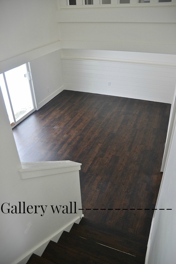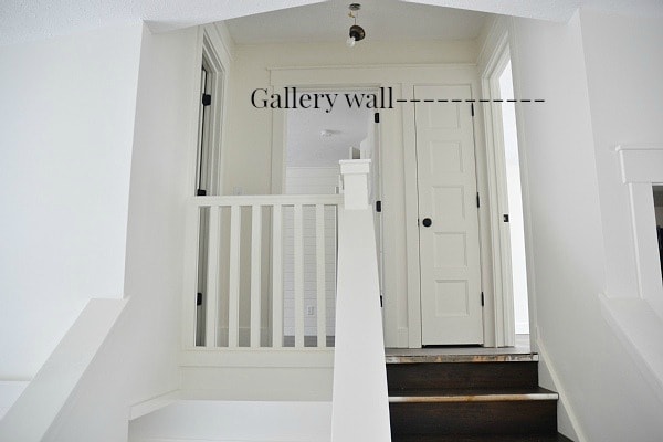 Here are some photos I took the day we moved into our house about a month ago when it was empty. These photos were even before we had light fixtures & before the movers came with our stuff, weird. They kind of give a general idea where I am talking about doing the gallery wall. The walls are small so the gallery wall would be on a smaller scale, but you get the idea. Here is the stairs leading to the upstairs…