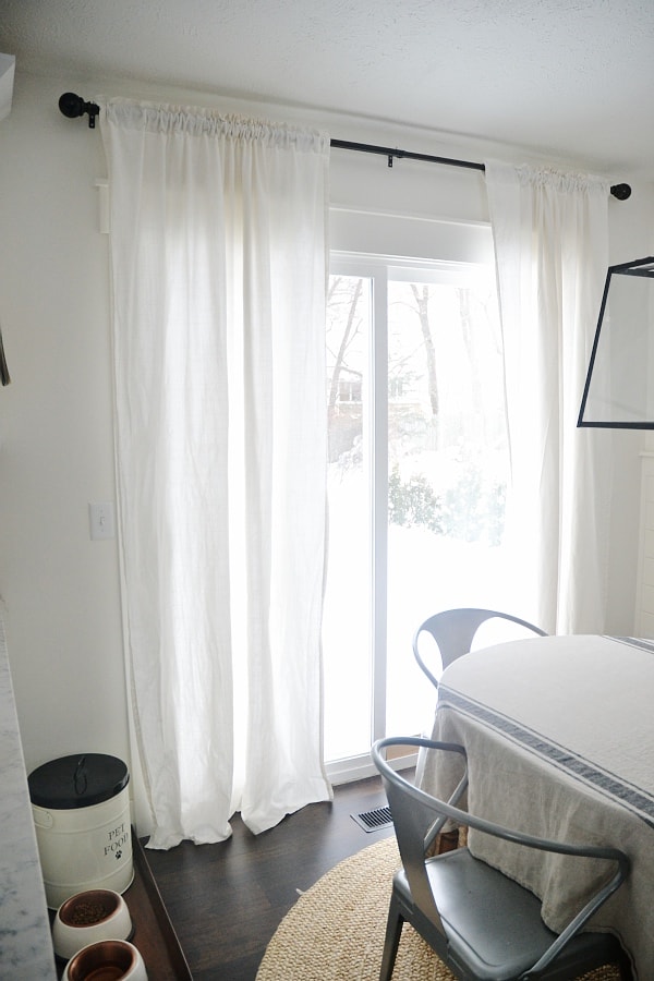 What?! I’m actually giving a Michigan house update? Yesterday I shared our DIY bathroom cabinet & today I’m sharing a few curtains that we have hung up in the house before. Why not more curtains than these? Because most of our windows are sitting there naked & curtain-less & sad. We did manage to hang some curtains up on the first level of our house & I made some DIY no-sew curtains for our lower level sliding door as well. One window at a time we are finally getting some privacy back!