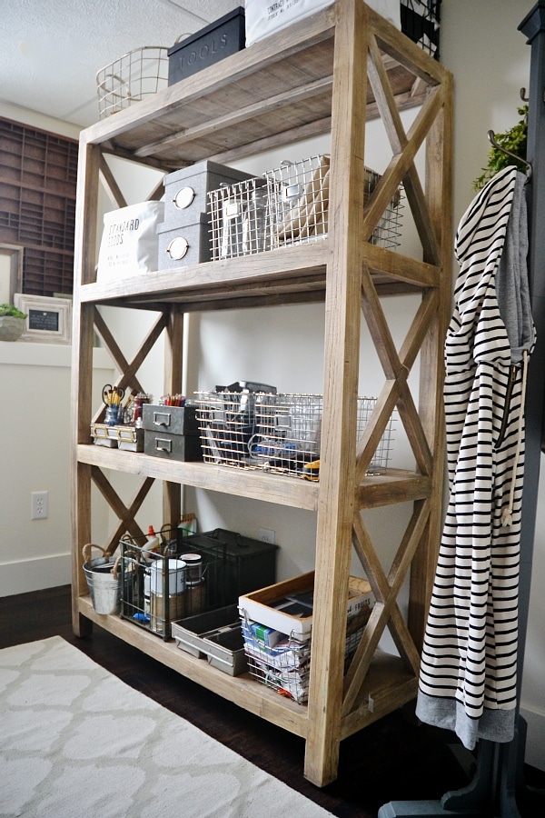 The new bookshelf is way cool! I love the design and the sturdy look it has, yet it doesn’t look like it belongs in a garage. The wood ir gorgeous. If you needed storage, that more than fills the bill, I can’t believe how much stuff you have in there, but it is all so organized and right at your fingertips. The green crates you added are perfect, like icing! I so wish there was a Home Goods store where I live, the closest is about 80 miles away. I’m also going right now to check out the Birch Lane line at Wayfair…hope it doesn’t become a new obsession! Lovin’ that bookshelf!