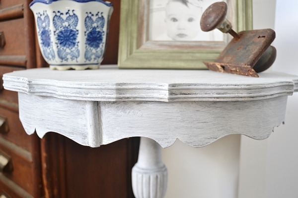 So how did I get this look? Super simple! First I dry brushed Maison Blanche maison white chalk paint all over the table. I didn’t try for perfection & wanted it to look old & used. After the dry brush paint was dry. I learned a new technique in the class of mixing a color wax with a clear wax & it worked amazing! I ended up mixing a Maison Blanche gray lime wax. The clear wax helps to “water” down the gray lime wax & make it less opaque. I spread the wax all over the table & actually didn’t wipe it off. That’s the beauty of this Maison Blanche wax is that you can leave it right on the piece & it will harden. I let it set for two days to dry & fully harden before I used it. The gray wax really looks great over the white chalk paint & added a lot of depth to the piece. I think it made it look like little white beachy table.