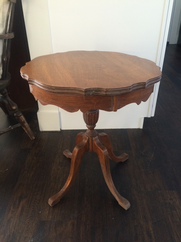 I still don’t have a permanent spot for this little table yet, but I really wanted to show you this cute little makeover. I can never keep the power of paint a secret! Here is how the little table was looking before I got my hands on it…