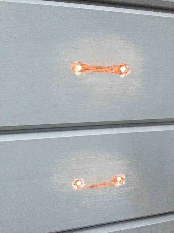 To achieve this look I painted two layers of french blue on the entire piece. I also I filled the holes where the old hardware was with wood filler [paintable wood filler works great.]. After the paint was dry I sanded the edges of the drawers & the entire dresser to give it more of an antique look. When I was done sanding I brushed a dark wax [also Maison Blanche] over the entire piece. I let the dark wax set for a couple of minutes & then took a rag & wiped all of the wax off. The wax sealed the piece & also deepened the color of the french blue a lot. For hardware I went with a long bar pull to really change up the look of the dresser & I’m kind of in love with the look. What do you think of the new hardware?