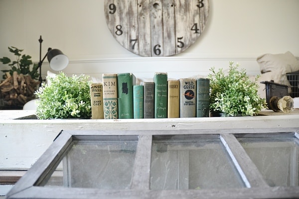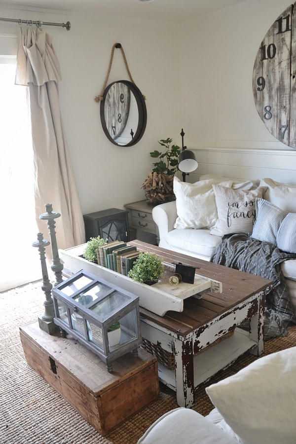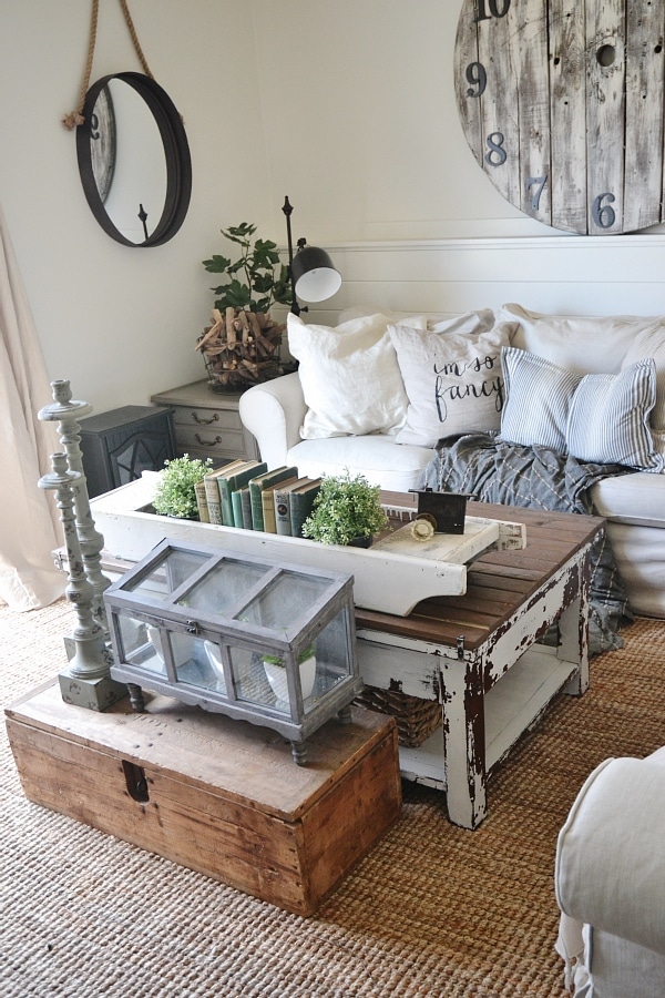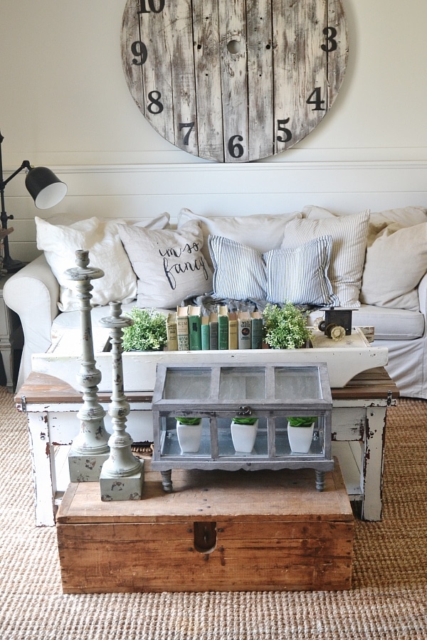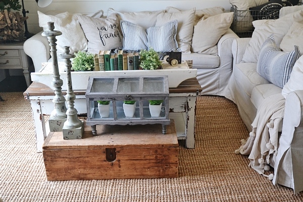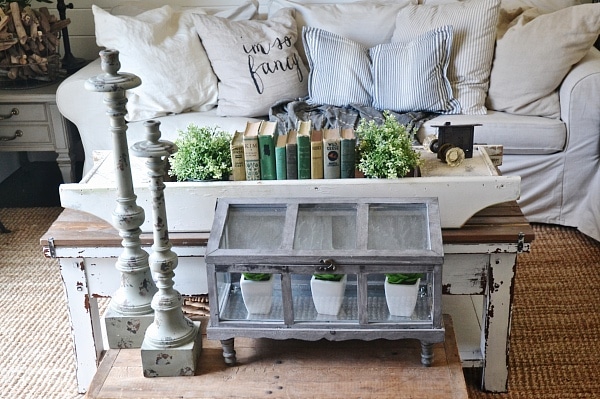 On our lower level living room coffee table it’s a little more layered, but still tons of room to use the coffee table because this is where we always sit & work, eat, & so on. In front of our DIY rustic coffee table we have an antique trunk. On top of the trunk we have a terrarium from Marshalls filled with succulents also from Marshalls. Next to the terrarium we have two candlesticks from Hobby Lobby. On top of the coffee table we have a long antique white wooden tray. Inside I have two plants from Ikea, some antique books, & an antique door knob. Simple, lovely, eclectic, & rustic. Pretty much my style.