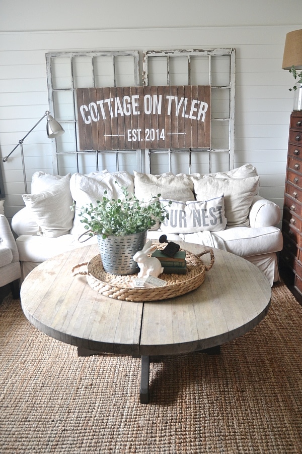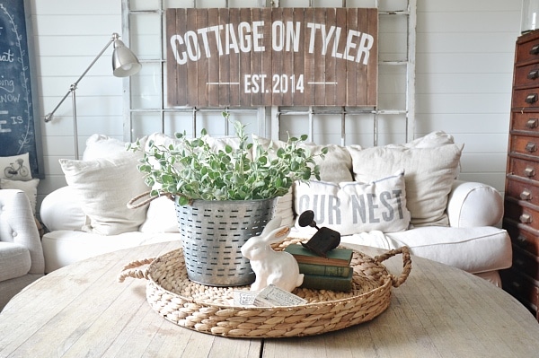 So, in our upstairs living room we have this DIY round coffee table that we made. On top of it is something super super simple for spring. I’ve really been into simplicity & throwing things away lately, so this little centerpiece makes me happy. I placed a large round wicker tray from Target in the center to the coffee table. In the tray I placed some antique books with an antique door knob on top. Some “coasters” which are really wood blocks. A white ceramic rabbit on the tray is one of my favorite finds recently from Target, & it’s gold ears kill me every time! I recently found this olive bucket also from Target [ok, I shop there way too much] & I filled it with greens from Michaels. Simple, lovely, & totally spring worthy.