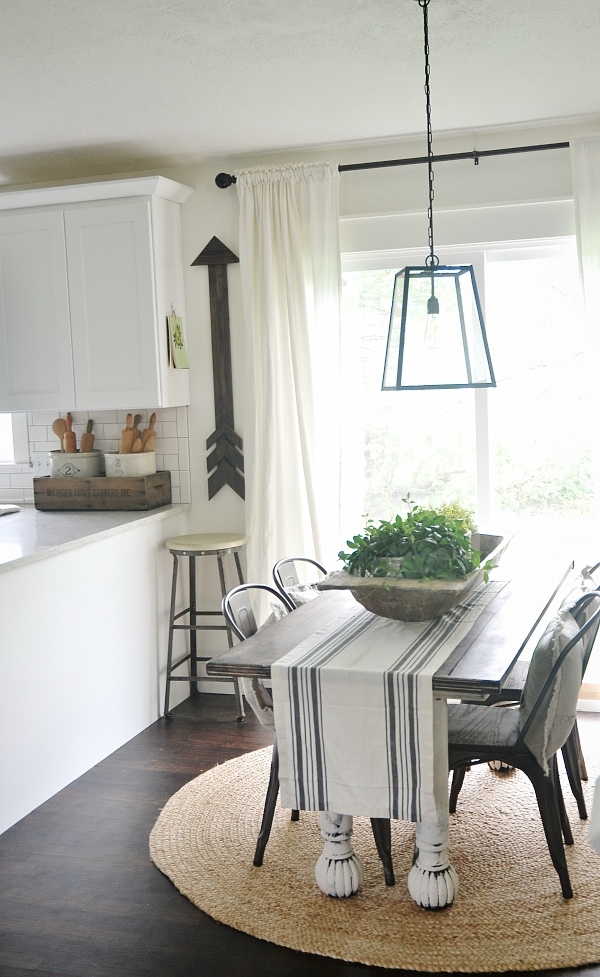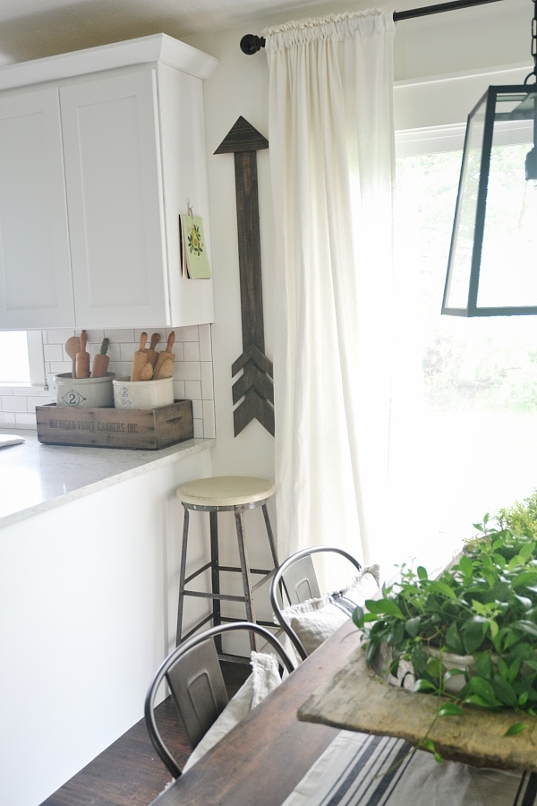 In our Michigan house we are slowly getting things up on our bare walls. It’s been fun finding little treasures here & there & really taking our time with our home. You know in our home, nothing is ever permanent in the spot that it’s in, but it’s fun for now playing around & trying new things. We do not have much wall space in our dining room or kitchen area & recently I found this cute little shop , Rustic Nest, who makes lovely wooden items including a large arrow that I fell in love with right away. I knew right away I wanted to try it on a skinny wall in our dining room & I’m pretty happy with how it looks in the spot & the fun detail it adds to our dining area….