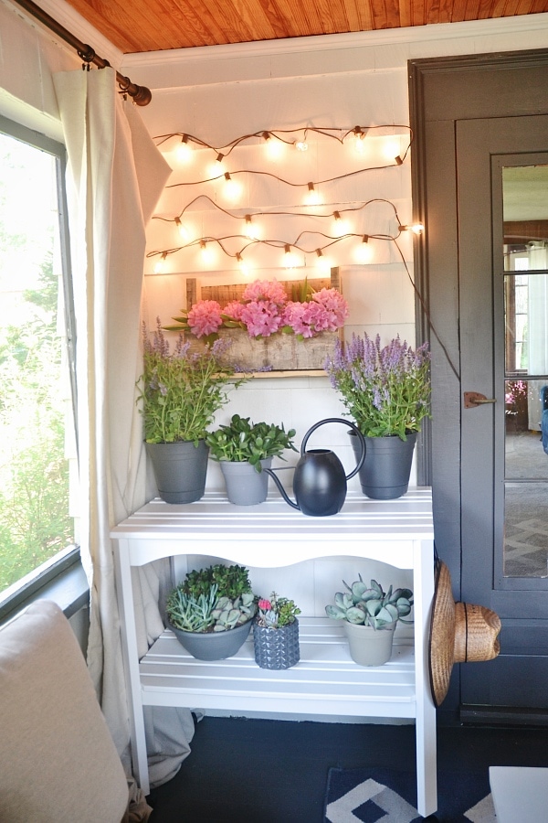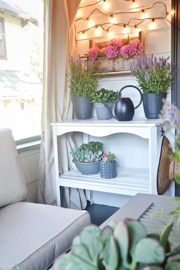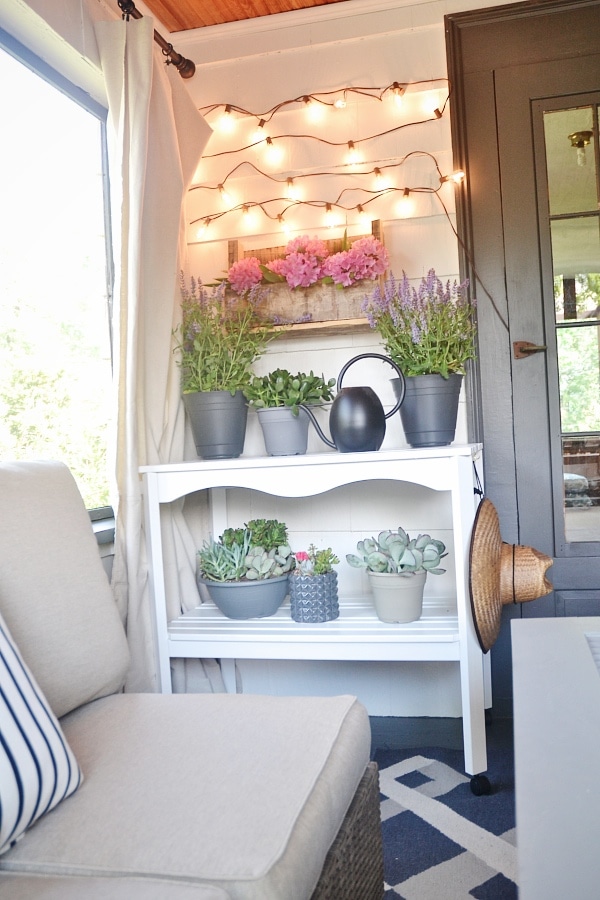 Next we grabbed a bunch of succulents from Lowes & for a quick & easy makeover we painted the pots a bunch of different shades of gray. Another super easy way to update your space! We placed the potted plants all around the room to bring the outdoors into the space & to add a charming little touch.