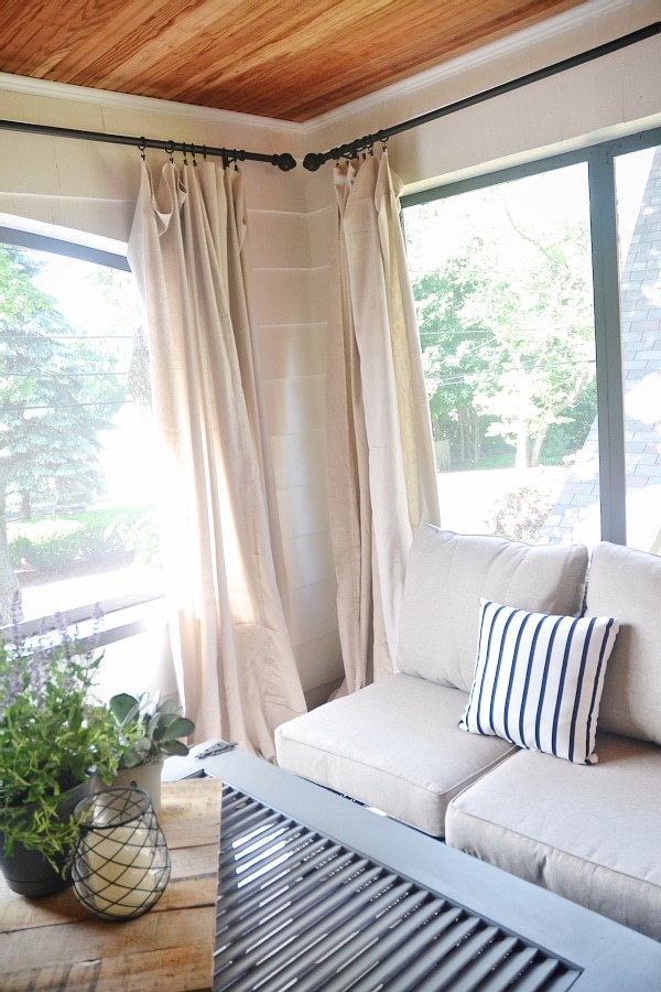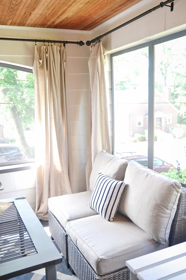 Day two was a fun day of some touch ups & installation. We made curtains for the space out of large drop cloths just like we did in our home [here]. We painted the doors & trim the same color as the floors [Kendall Charcoal ] We decided to leave the ceiling alone because we loved it bare & thought the bare added warmth to the space. I really wanted the sunroom to just be an extension of the interior of the home & look like a cozy living room & I think we accomplished that.