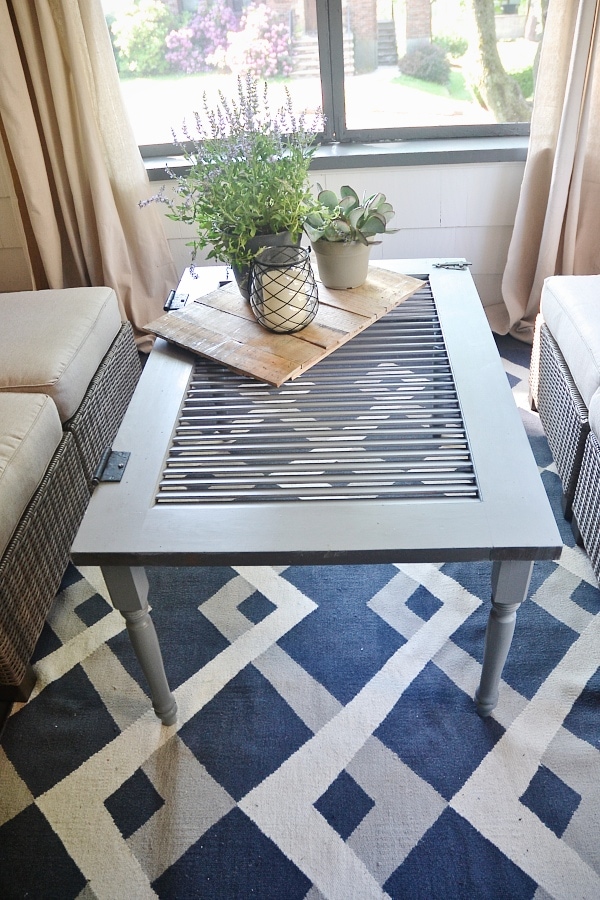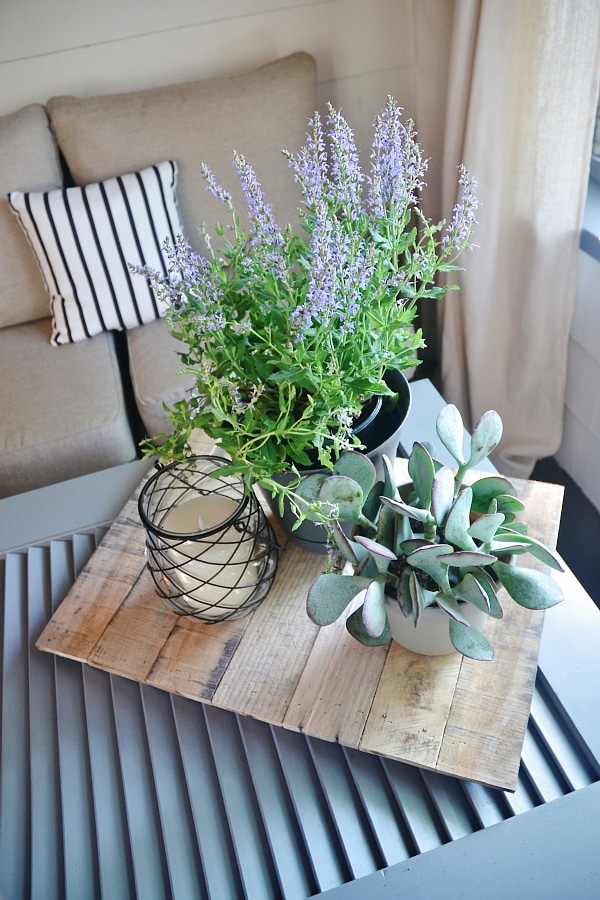 For the coffee table we decided to go the DIY route & use a door that we found in their basement. We cut the door in half & added some wooden legs to the the bottom of the table & painted the top & legs in Valspar revere pewter. That’s it. A 5 minute DIY table. Mr. LMB also built a quick and easy pallet tray for the top of the table to set drinks and such on, but the nice thing about this door table is that there is a large edge to the table where things can be places as well.