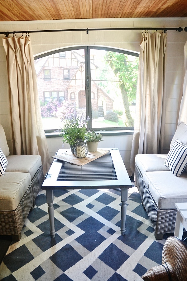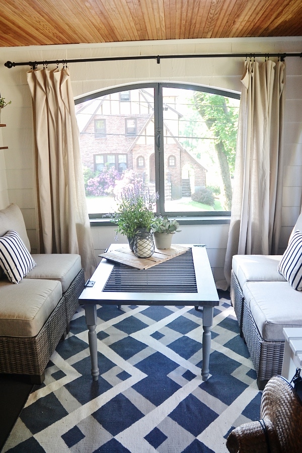 One big thing we wanted to do for the homeowners was replace all of their screens in the space. They were old & falling apart. They said this past winter really did a number on them & they kept falling out into the room. Mr. LMB really worked his magic on them by reinforcing all of the wood, painting them the color of the trim in the space, & replacing the screens in the frames. It was a pretty easy fix, but made a huge difference in the space & made the sunroom more useable for the family.