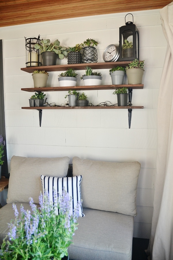 Next we started a whole bunch of DIY projects. First up was our DIY shelves. We stained boards cut to the size we wanted & spray painted some very inexpensive ‘L’ brackets used in closets & garages to make the shelves in the corner. It’s such an easy & inexpensive way to add shelving to your home & the nice part is you can customize it to your home decor style by staining the wood any color you want & the same goes for spray painting the brackets. The shelves were perfect for some greenery & eventually she can add her own personal touches to them as well.