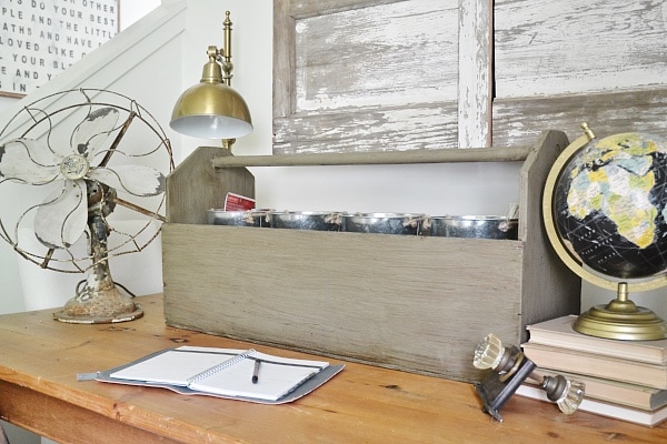 You know, a quick cell phone shot because I have no patience to grab my camera to take photos when I’m about to paint. Yup. Anyways, so I used Maison Blanche spanish moss as the base coat & then put maison blanche dark wax over top to seal it & give it more of a distressed look. This literally took me no time at all & gave a whole new life to this tool box. Inside the tool box I placed some metal containers I found in the dollar section at Target & filled them with craft supplies like colored pencils, chalk, stencils, & more. This would make a great table centerpiece, on a book shelf, in an office to hold you or your kids craft supplies for easy accessibility.