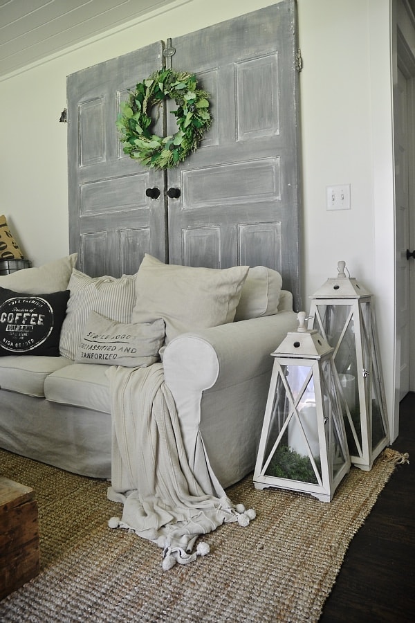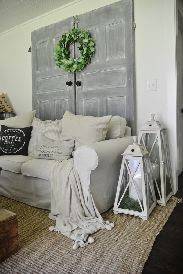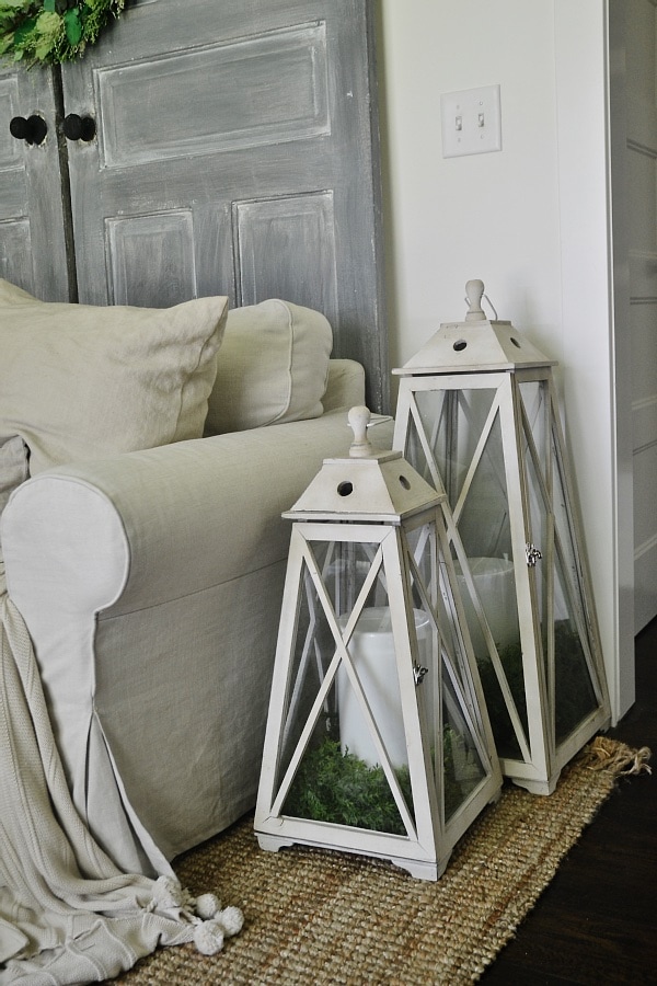 These lanterns I replaced our side table with for the summer. The side table was never used & kind of big for the space, so these work here for now. they are from HomeGoods & all I did was place some large battery powered candles from Target in them & place some greenery at the bottom. Pretty cool! These probably won’t be staying here, but for now they are fun & work with the space.