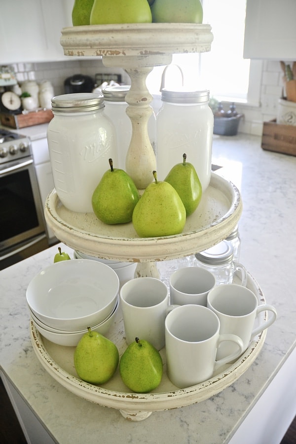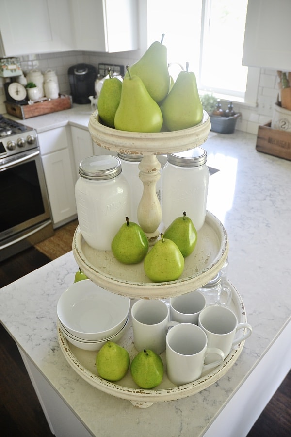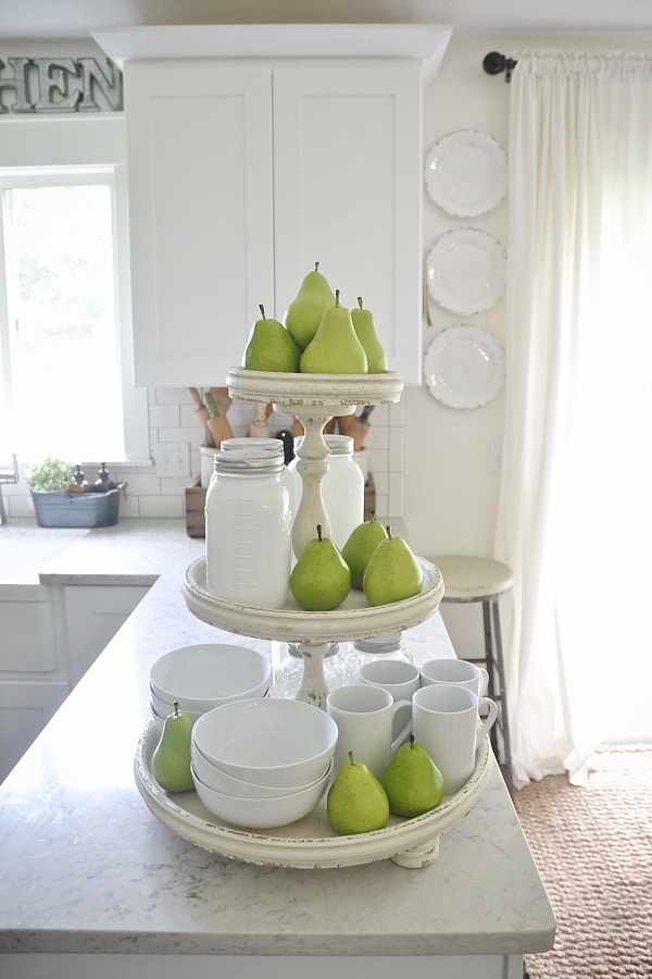 We got some happy mail this weekend that I couldn’t wait to share with you guys! I ordered a few pieces from my collection at Painted Fox for our home & I just had to show you the three tiered stand that I styled quickly today. I’m holding on to summer as long as I can in our decor & I’m also holding on to simplicity these days. I think the three tiered stand fits in so well with our kitchen & adds the perfect cottage decor touch. It’s like it was made for our little cash. I’m already excited to decorate it in different ways… but for now here is what it is looking like…