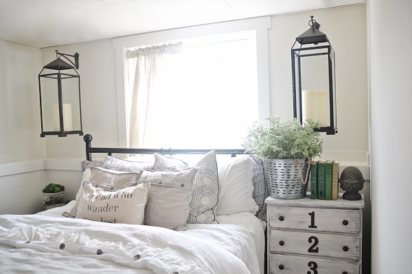 & as promised, here is a little sneak peek of what we are working on in the guest bedroom downstairs. Remember [here] where we decided to switch the office and the guest bedroom? Well, it’s coming right along. I’ve had this idea forever to hang lanterns by the bed, & really thought we would be doing it in our master bedroom, but that didn’t really work out. So, here the lanterns are all hung in the guest bedroom. I’m loving it so far! Now, the window is off center, but I have a way to conceal that a little bit so stay tuned for a full guest bedroom update & more info on these lanterns. Until then, I hope you enjoyed my little World Market haul, & our guest bedroom sneak peek. Let me know what you think in the comments below, find me on Facebook, & chat with me on Instagram.