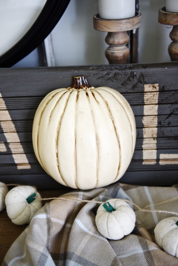If you follow me on periscope [Liz Marie Blog on there if you want to find me] I did a video on how to make this sign & get your faux pumpkins to look like this. If you ever wanted to watch awkward videos of me, hear my voice, & get sneak peeks of the house and projects I suggest you follow me on there. But, for those of you who missed the live periscope session then here is a run down of how I made this lovely fall sign…