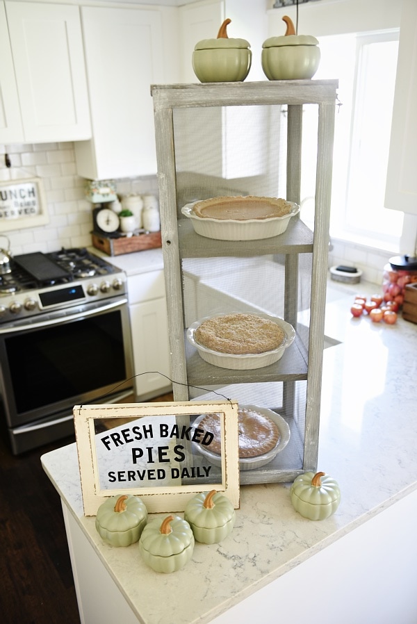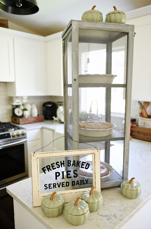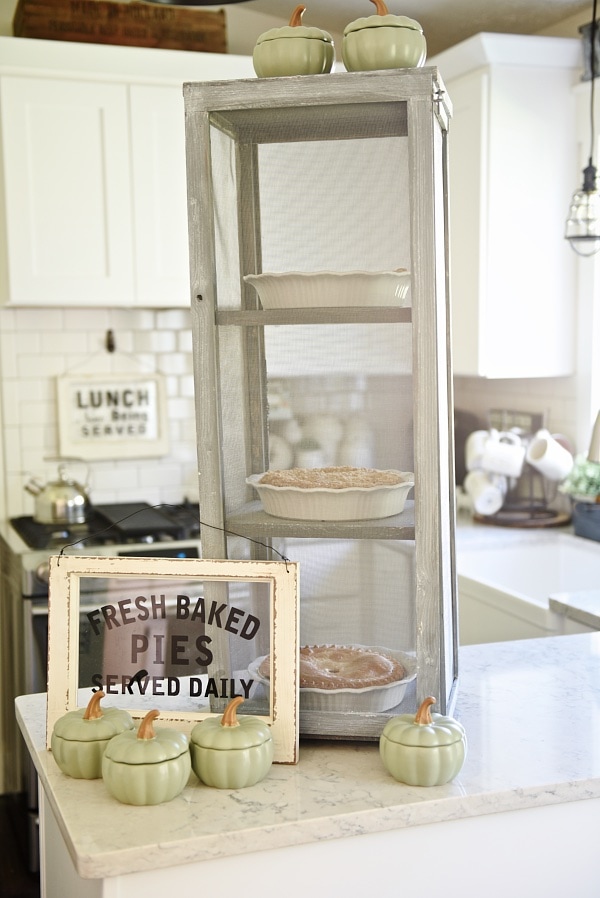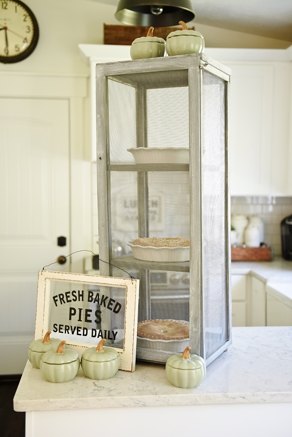 This piece is a little large in our kitchen, but honestly I think we could rock it, but this would look amazing in a larger kitchen. Also, it’s not just for pies but would look AMAZING styled with some pumpkins inside, plants, & other lovely pretty kitchen items. You can see how to make your own DIY mini pie safe over on my amazing husband’s blog [here] What’s amazing about this piece is that you can customize it however you want as far as size, color, material, and uses for it. Who doesn’t need a cute little pie safe?!
