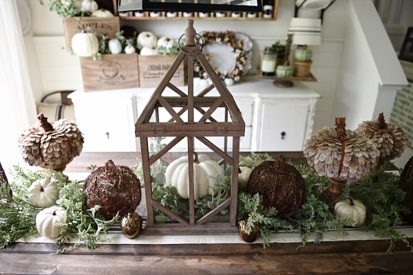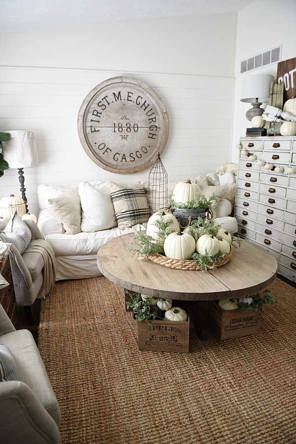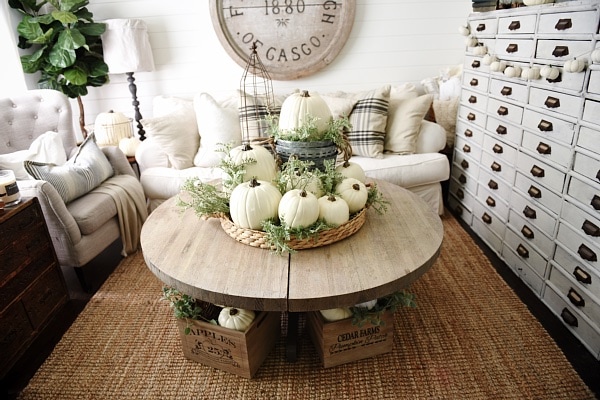 […] you have a large entry, I think this display via Liz Marie Blog is just perfect! I am in love with the round rustic table piled with white pumpkins in different […]