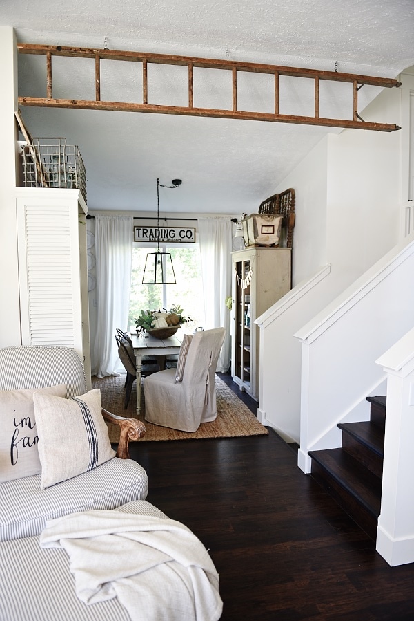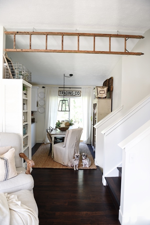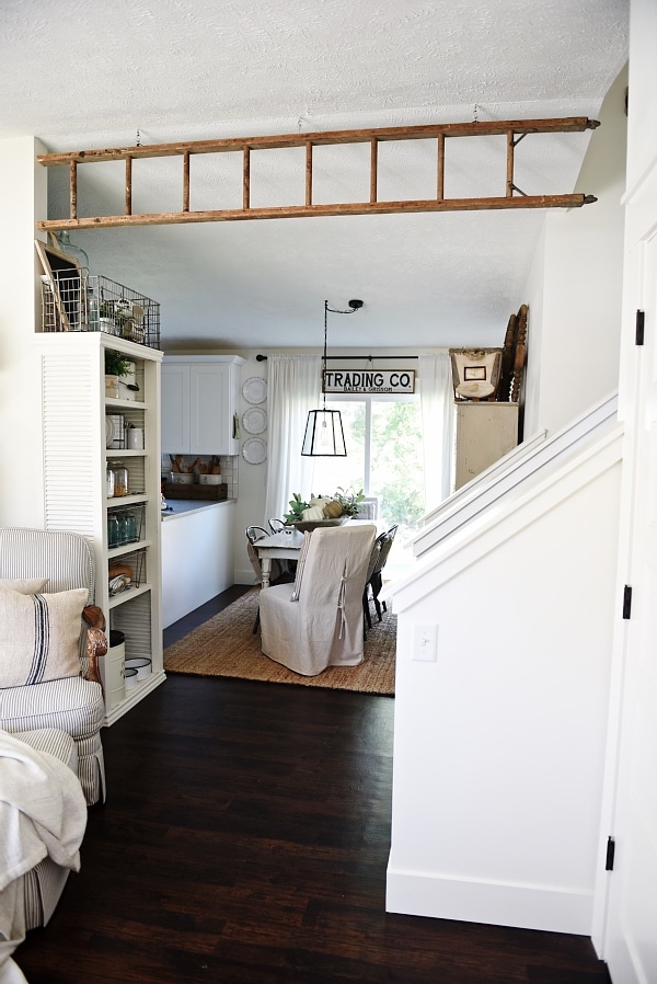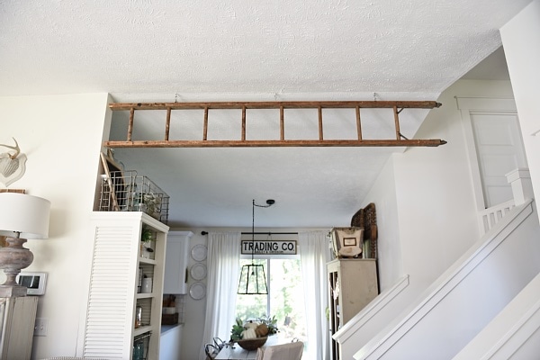 We found this ladder on one of our junkin’ adventures & had it sitting in our garage for a few months waiting to be used. To hang the ladder we simply measured the space of the area we wanted & cut the ladder to size. We had to cut 10 inches off the bottom of our ladder. After that we found some studs in the ceiling. We then drilled holes for the eye hooks & screwed the eye hooks into the ceiling. We screwed eye hooks into the ladder to match up with the ones in the ceiling & hung the ladder up by connecting the ceiling eye hook & the ladder eye hook with an s-hook. So simple!